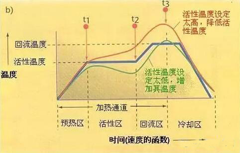 活性區(qū),有時(shí)叫做干燥或浸濕區(qū),這個(gè)區(qū)一般占加熱通道的33~50%,有兩個(gè)功用,第一是,將PCB在相當(dāng)穩(wěn)定的溫度下感溫,允許不同質(zhì)量的元件在溫度上同質(zhì),減少它們的相當(dāng)溫差。第二個(gè)功能是,允許助焊劑活性化,揮發(fā)性的物質(zhì)從錫膏中揮發(fā)。一般普遍的活性溫度范圍是120~150°C。