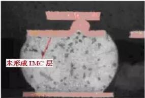 冷焊發(fā)生的原因主要是焊接時熱量供給不足,焊接溫度未達到釬料的潤濕溫度,因而結(jié)合界面上沒有形成IMC或IMC過薄,如左圖所示。有的情況下,界面上還存在著裂縫,如圖所示。
