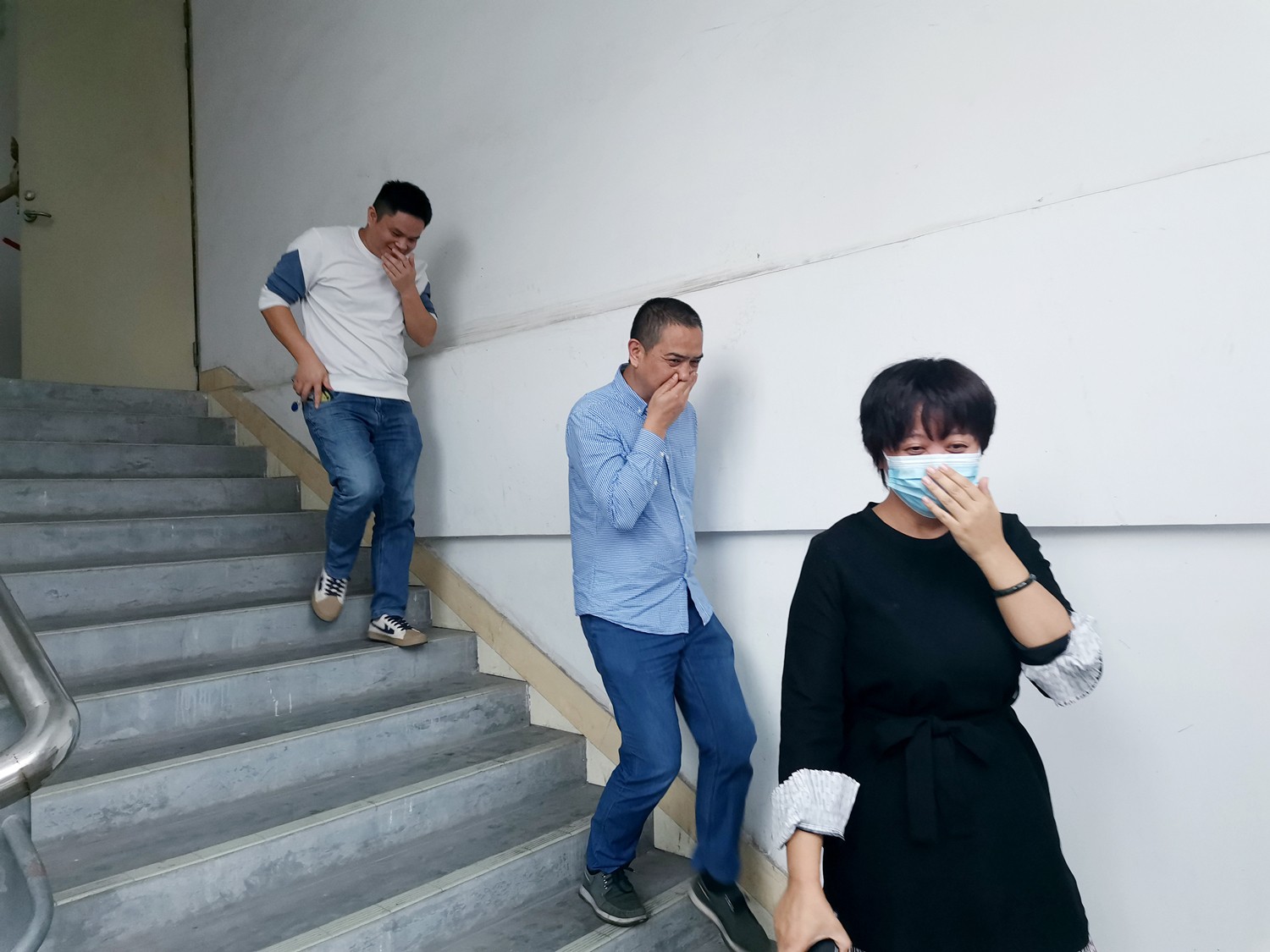下午4點(diǎn)整,警鈴響起,公司員工一邊掩住口鼻并迅速有序下樓撤離。